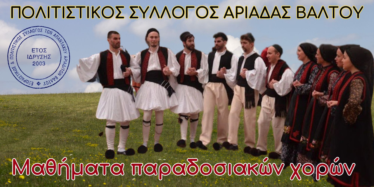 Το ΔΣ του Πολιτιστικού Συλλόγου Αριαδιτών Βάλτου, σας προσκαλεί να συμμετάσχετε στα μαθήματα παραδοσιακών χορών που θα ξεκινήσουν την Τετάρτη 29/11 ώρα 19:15 στη σχολή χορού The Dance Club (Πανόρμου 30 - πλησίον μετρό).