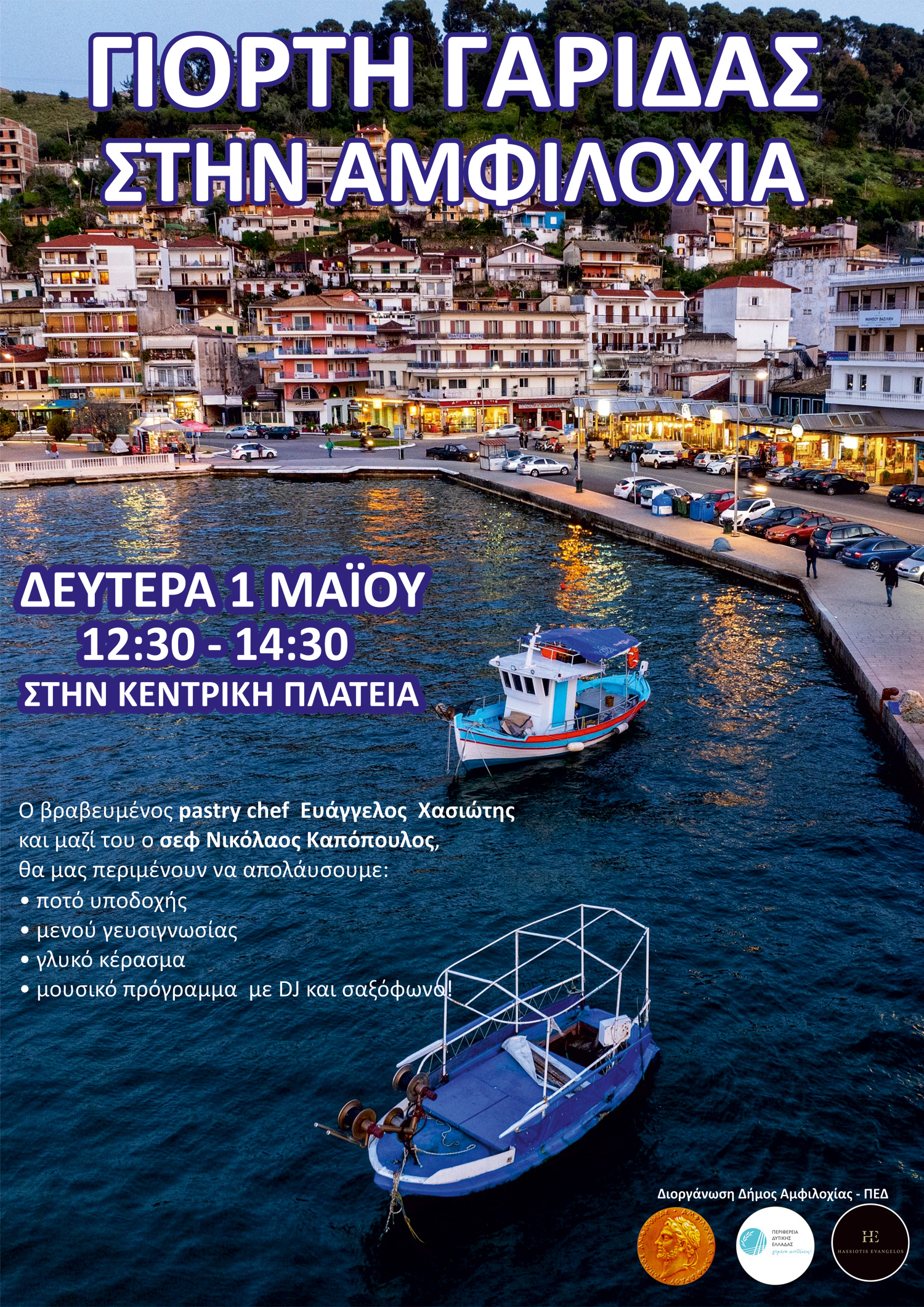 Την Πρωτομαγιά, από τις 12:30 έως τις 14:30 στην κεντρική πλατεία Αμφιλοχίας, θα σας περιμένουν ο βραβευμένος pastry chef Ευάγγελος Χασιώτης και μαζί του ο σεφ Νικόλαος Καπόπουλος, για να σας προσφέρουν ένα πλούσιο μενού γευσιγνωσίας με πρωτότυπες και εύγευστες συνταγές.
