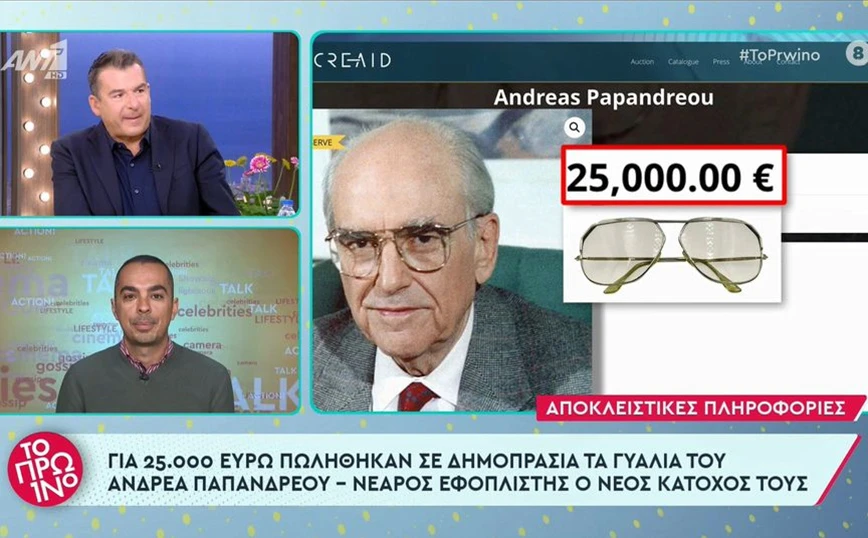 Ένας νεαρός εφοπλιστής, που δεν θέλει να κάνει γνωστή την ταυτότητά του, έδωσε 25.000 ευρώ για να αποκτήσει σε δημοπρασία τα γυαλιά του Ανδρέα Παπανδρέου, στον οποίο έχει μεγάλη αγάπη σύμφωνα με την εκπομπή «Το Πρωινό».