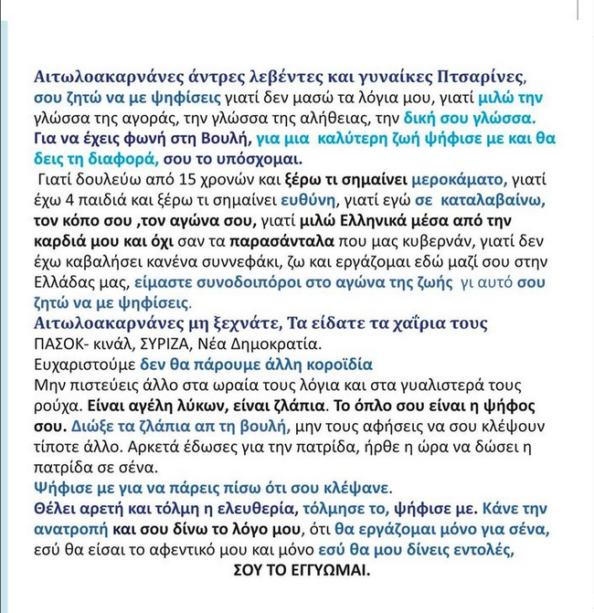 Το σημείωμα της ξεκινά με το «Αιτωλοακαρνάνες άντρες λεβέντες και γυναίκες πτσαρίνες!» και είναι αδύνατο να ξεχαστεί, χρησιμοποιώντας μια διαδεδομένη τοπική λέξη για τις δυναμικές γυναίκες.Ζητά την ψήφο γιατί όπως λέει «δεν μασά τα λόγια της» και μιλά την γλώσσα της αλήθειας. «Το όπλο σου είναι η ψήφος, διώξε τα ζλάπια απ΄ τη βουλή» τονίζει παρακάτω, απτόητη…