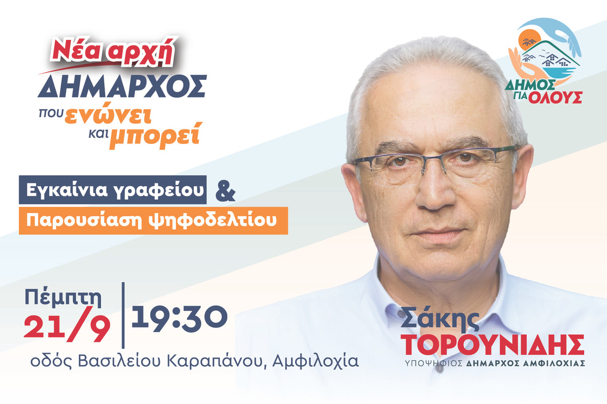 Την Πέμπτη 21/09 τα εγκαίνια του γραφείου του Σάκη Τορουνίδη στην Αμφιλοχία.