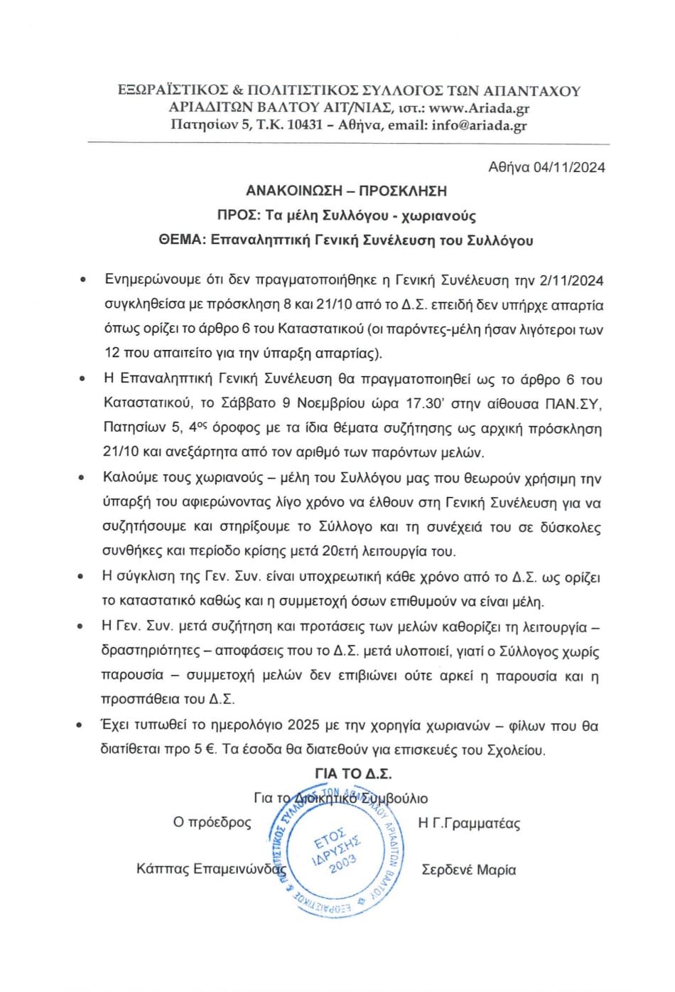 Σύλλογος Αριαδιτών Βάλτου: Επαναληπτική Γενική Συνέλευση του Συλλόγου.