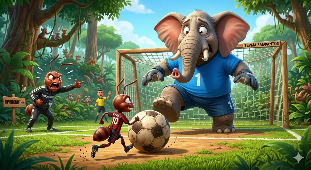 Βγαίνει τετ-α-τετ. Ο τερματοφύλακας–ελέφαντας κάνει μια τεράστια προσποίηση προς τη λάθος γωνία. Το μυρμήγκι χαμογελάει. Η δόξα είναι ένα απαλό πλασέ μακριά. Πάει να σουτάρει… και τότε μπαμ. Η πατούσα του ελέφαντα κατεβαίνει σαν ταβάνι ασανσέρ που χάλασε. Το μυρμήγκι γίνεται αυτοκόλλητο στο χορτάρι. Ο προπονητής των μυρμηγκιών πετάγεται όρθιος, έξαλλος, και φωνάζει προς τον πάγκο των ελεφάντων: «Εεεε! Άμα είναι να παίξουμε κι εμείς έτσι, το σηκώνουμε το κύπελλο από τώρα!»
