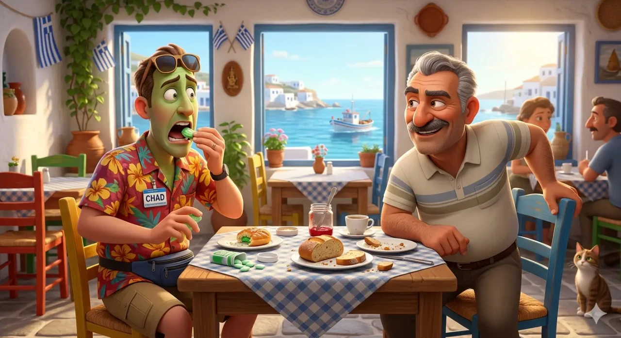 — Τρώτε ολόκληρο το ψωμί, εσείς οι Έλληνες; — Φυσικά, απαντά ο Έλληνας χωρίς να σηκώσει βλέμμα. — Εμείς όχι. Τρώμε μόνο το μέσα. Το έξω το μαζεύουμε, το ανακυκλώνουμε, το κάνουμε κρουασάν και σας το πουλάμε. Ο Έλληνας συνεχίζει το πρωινό του ατάραχος. — Τρώτε μαρμελάδα εσείς; — Φυσικά. — Εμείς όχι. Τρώμε φρέσκα φρούτα. Τα υπόλοιπα—κουκούτσια, φλούδες, ό,τι περισσεύει—τα ανακυκλώνουμε, τα κάνουμε μαρμελάδα και σας τα πουλάμε. Ο Έλληνας τον κοιτάει για πρώτη φορά, ήρεμος, και ρίχνει την ερώτηση: — Τα προφυλακτικά, μετά τη χρήση, τι τα κάνετε; Ο Αμερικάνος στραβώνει. — Τα πετάμε, φυσικά. Και τότε ο Έλληνας χαμογελάει για πρώτη φορά. — Εμείς πάλι όχι. Τα μαζεύουμε, τα ανακυκλώνουμε… τα κάνουμε τσίχλες και τα πουλάμε σε κάτι Αμερικανάκια. Αυτές με γεύση φρούτων έχουν τρελή πέραση!!!!!!!!!.