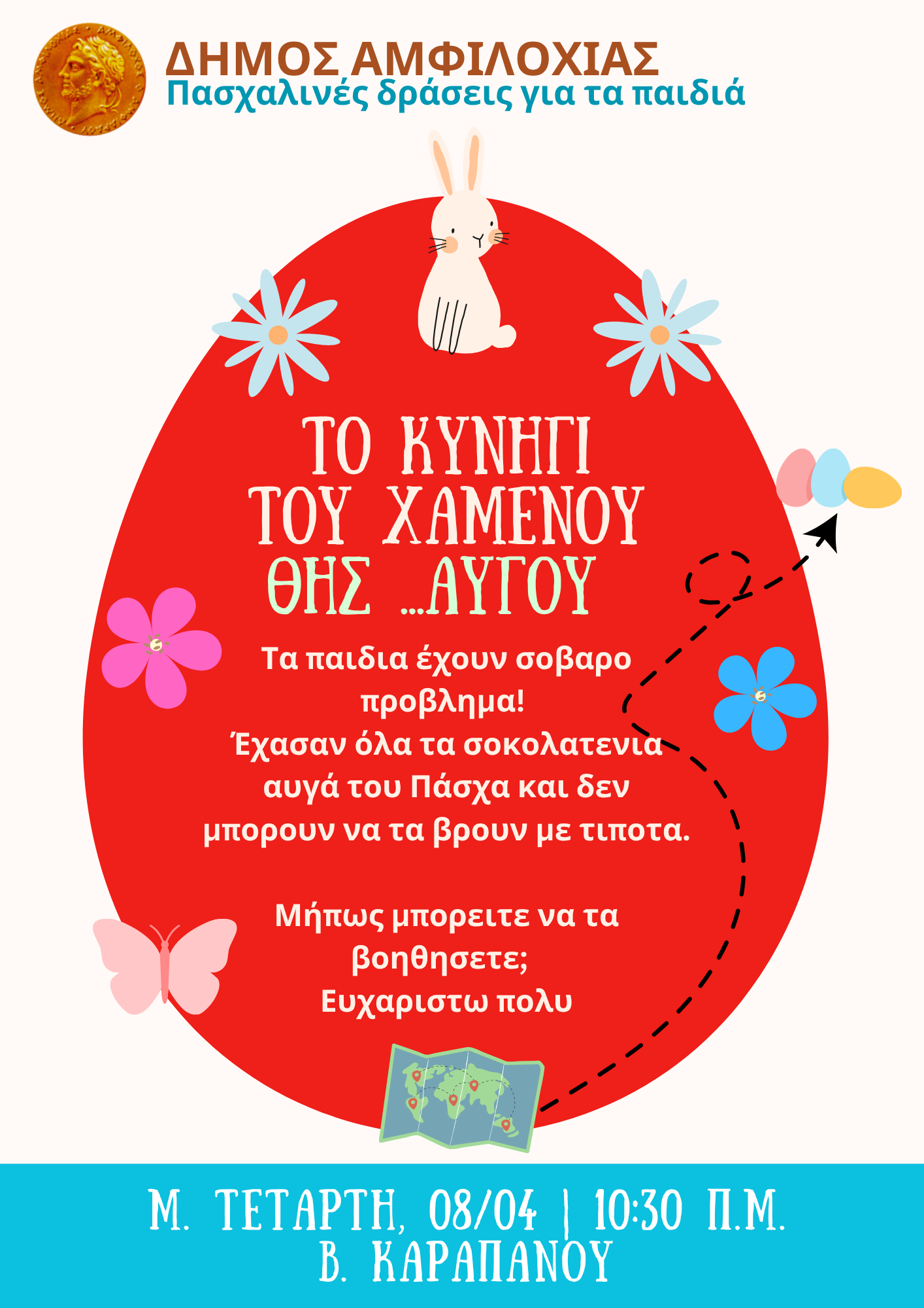 Πασχαλινές δράσεις για παιδιά διοργανώνει ο Δήμος Αμφιλοχίας τη Μεγάλη Τετάρτη 8 Απριλίου 2026 στις γειτονιές της Αμφιλοχίας, οι οποίες θα γεμίσουν με παιχνίδια, δραστηριότητες και παιδικές φωνές.